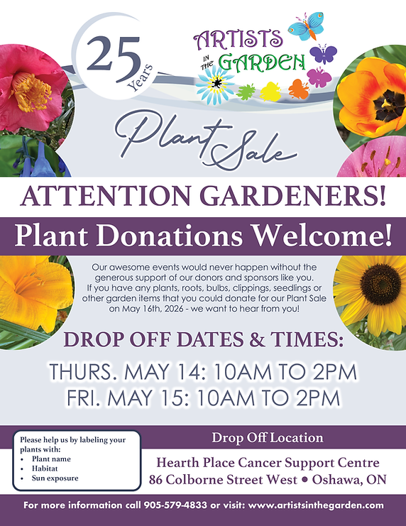 Mark your calendars for the 15th annual Plant Sale. This event is hosted by the Artists in the Garden committee on May 16, 2026, in the Hearth Place parking lot. A variety of plants including perennials, annuals, etc. will be available for sale. Most plants will range from $1 to $5 depending upon the size. To see our plant sale poster, Click here!